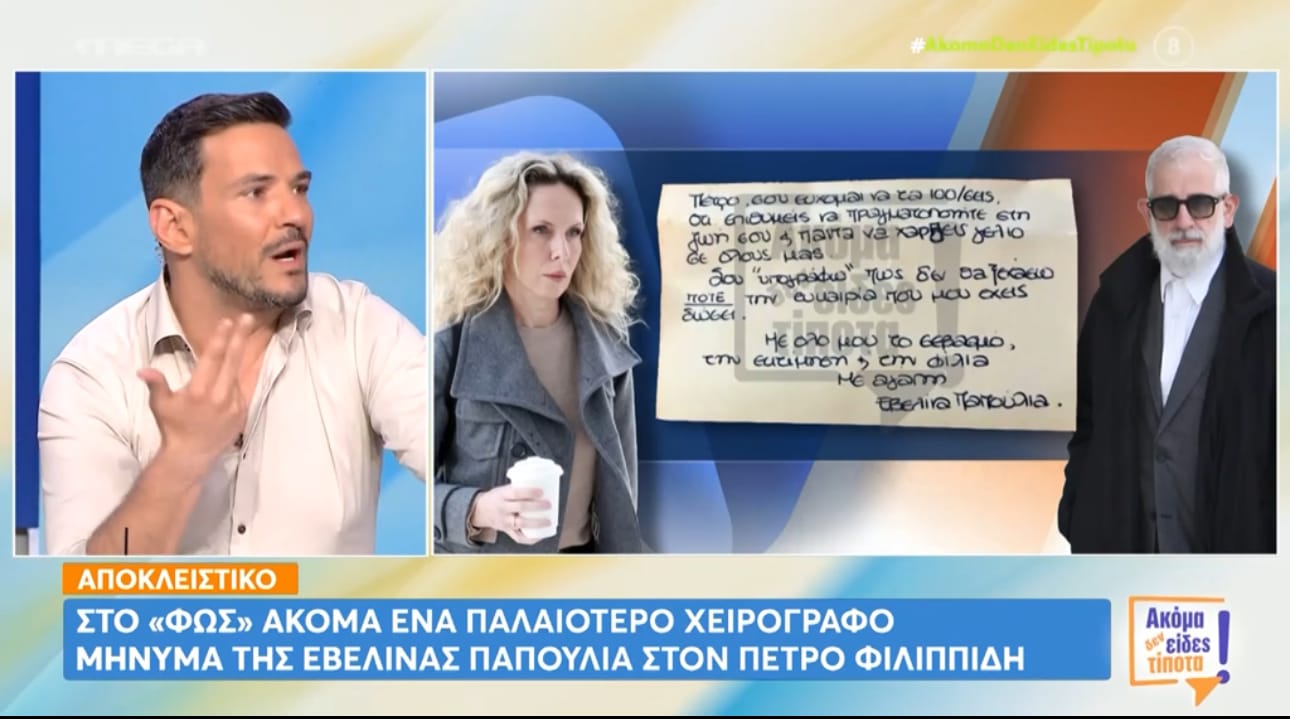 Σήμερα στο φως ένα νέο χειρόγραφο σημείωμα που φέρεται να έστειλε η Εβελίνα Παπούλια στον Πέτρο Φιλιππίδη. Η σχέση τους, η οποία ξεκίνησε επαγγελματικά, αποκτά νέα διάσταση με αυτή την αποκάλυψη και το σημείωμα προσθέτει στοιχεία στην ήδη πολύκροτη υπόθεση.