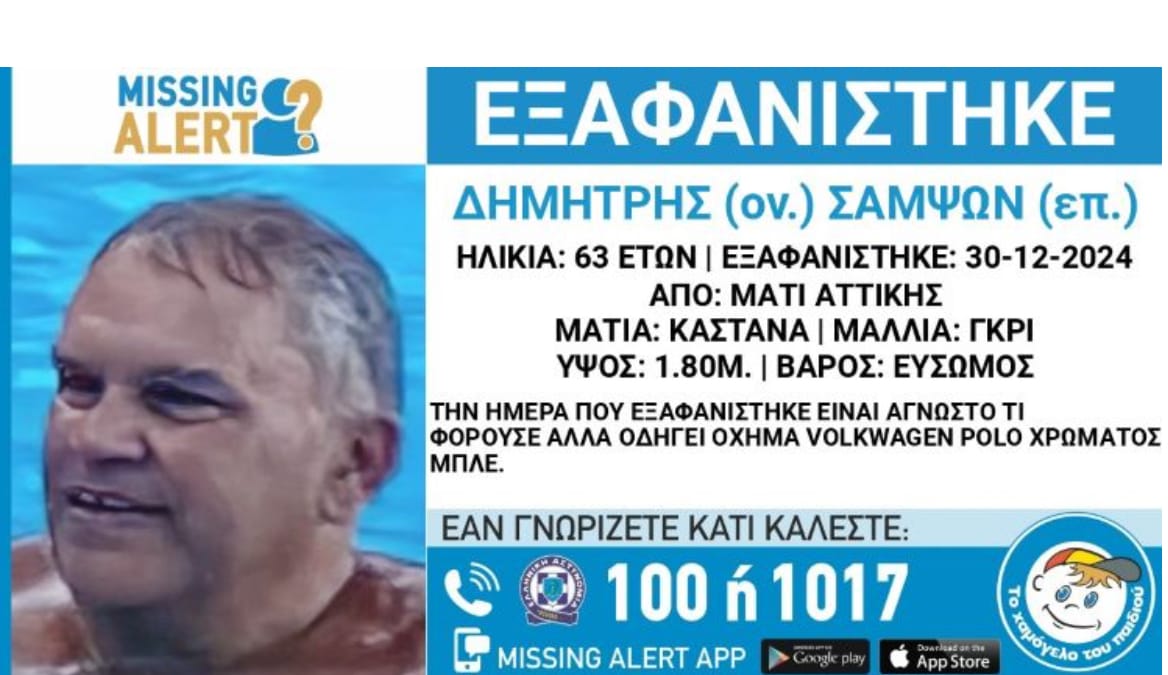Συναγερμός έχει σημάνει για την εξαφάνιση του 63χρονου Δημήτρη Σαμψών, ο οποίος αγνοείται από την περιοχή Μάτι Αττικής. Σύμφωνα με τις πληροφορίες, ο Δημήτρης έχει ύψος 1,80μ, είναι εύσωμος, έχει γκρι μαλλιά και καστανά μάτια. Την 30η Δεκεμβρίου 2024, η οικογένειά του δήλωσε την εξαφάνιση του στην αστυνομία, και μέχρι σήμερα η τύχη του παραμένει άγνωστη.