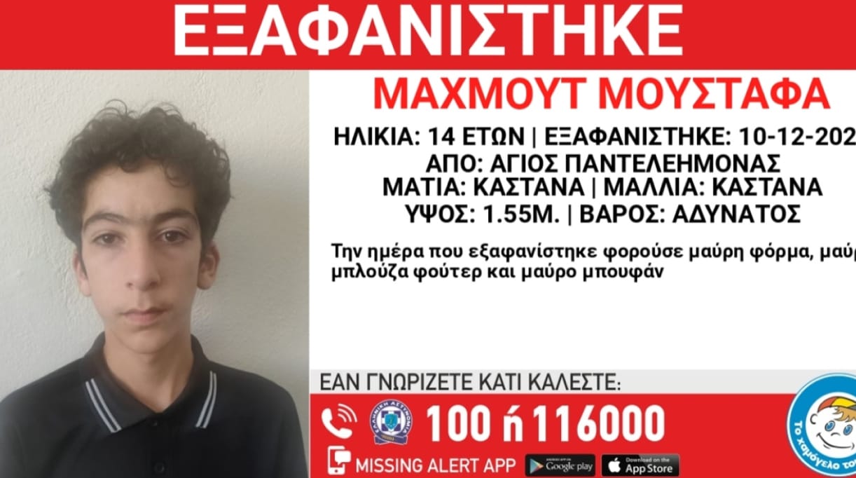 Συγκλονιστικά νέα προέρχονται από τον Άγιο Παντελεήμονα, όπου ο 14χρονος Μαχμούτ Μουσταφά, συριακής καταγωγής, εξαφανίστηκε από χώρο φιλοξενίας το βράδυ της 10ης Δεκεμβρίου 2024. Ο Μαχμούτ έχει ύψος 1.55 μ., είναι αδύνατος με καστανά μαλλιά και καστανά μάτια.