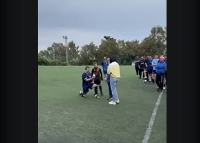 Όπως αναφέρει το evima.gr, ο νεαρός ποδοσφαιριστής, πριν την επίσημη απονομή, προσποιήθηκε ότι τραυματίστηκε, δημιουργώντας μια άμεση αναστάτωση στις εξέδρες. Πριν οι θεατές καταλάβουν, πήρε αυθόρμητα το μικρόφωνο και άνοιξε την καρδιά του. Οι παίκτες και οι φίλαθλοι παρακολουθούσαν με αγωνία, καθώς η πρόταση αντέτεινε την ιδέα ότι η ζωή είναι γεμάτη από εκπλήξεις.