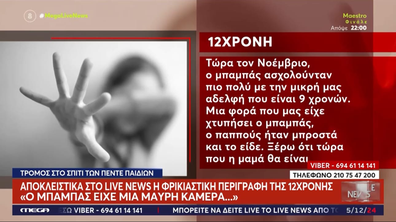 Ο μπαμπάς μου τα έκανε όλα αυτά από τότε που ήμουν 7 ετών. Ήταν βίαιος, με τραβούσε και με ανάγκαζε να κάνω πράγματα που δεν έπρεπε. Όλα αυτά γίνονταν στο σπίτι μας. Μία φορά ο μπαμπάς με είχε στο σαλόνι και η μαμά ήταν στο δωμάτιο της, δεν ήταν μπροστά κοιμόταν. Συνήθως κοιμόνταν και τα αδέρφια μου στα μέσα δωμάτια, τότε έμενα μόνη μαζί του».