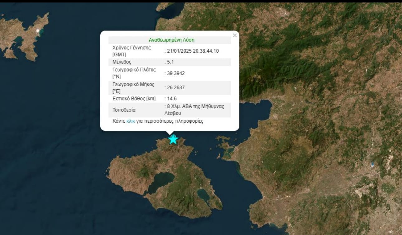 Το βράδυ της τρίτης, 21 Ιανουαρίου, οι κάτοικοι της Μυτιλήνης βίωσαν μια ισχυρή σεισμική δόνηση μεγέθους 5,1 Ρίχτερ. Ο σεισμός ταρακούνησε το νησί, προκαλώντας ανησυχία στους κατοίκους, οι οποίοι όσο ήταν αναμενόμενο, αντέδρασαν γρήγορα και βγήκαν στους δρόμους για λόγους ασφαλείας. Η διάρκεια της δόνησης ήταν αρκετά μεγάλη, γεγονός που επισημαίνουν και οι τοπικοί ιστότοποι.
