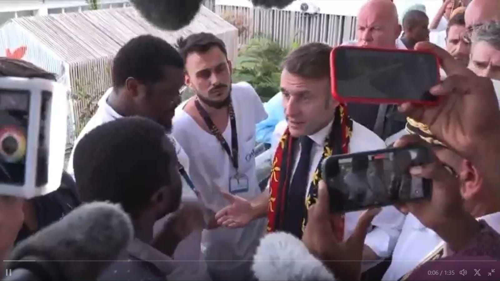 Μακρόν παραιτήσου!», «λες μ…κιες», «νερό, νερό, νερό», του φώναζαν χθες το βράδυ νεαροί και μητέρες. Ο Μακρόν απάντησε: «δεν φταίω εγώ για τον κυκλώνα! Δεν είμαι υπεύθυνος» για τον κυκλώνα.