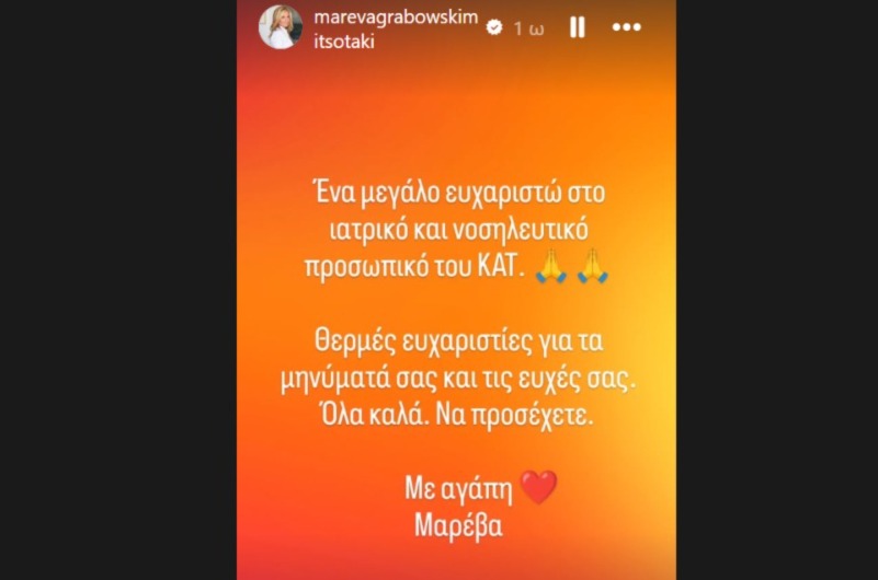 Στο προσωπικό της Instagram story, έγραψε: «Ένα μεγάλο ευχαριστώ στο ιατρικό και νοσηλευτικό προσωπικό του ΚΑΤ. Θερμές ευχαριστίες για τα μηνύματά σας και τις ευχές σας. Όλα καλά. Να προσέχετε. Με αγάπη, Μαρέβα».