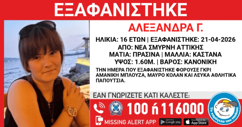 Σε κατάσταση συναγερμού βρίσκονται οι Αρχές για την εξαφάνιση της 16χρονης Αλεξάνδρας Γ., τα ίχνη της οποίας χάθηκαν το απόγευμα της Τρίτης (21/04) από χώρο παιδικής προστασίας στη Νέα Σμύρνη.