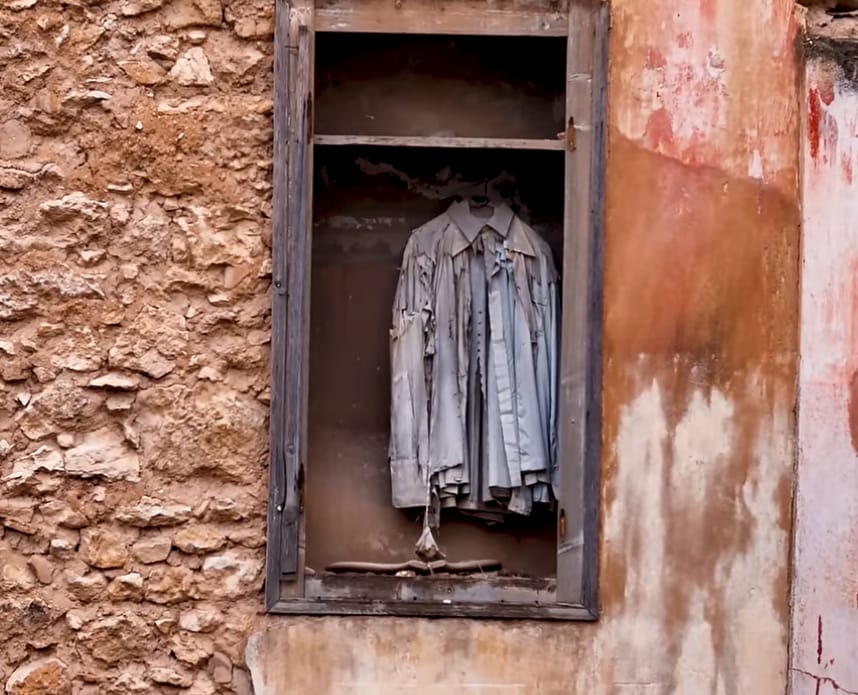 Το πουκάμισο κρέμεται σε μία κρεμάστρα που βρίσκεται σε έπιπλο που θυμίζει ντουλάπα, στον πρώτο όροφο μιας πολυκατοικίας που έχει καταρρεύσει. Σύμφωνα με τις φήμες, ανήκε στον Μιχάλη Γάλλια, έναν σκιτσογράφο που έζησε και εργάστηκε στον Πειραιά κατά τον 20ό αιώνα. Ο Γάλλιας ήταν γνωστός για τις γελοιογραφίες και τα κόμικς του, που δημοσιεύτηκαν σε περιοδικά της εποχής όπως το Πάνθεον και η Μάσκα.