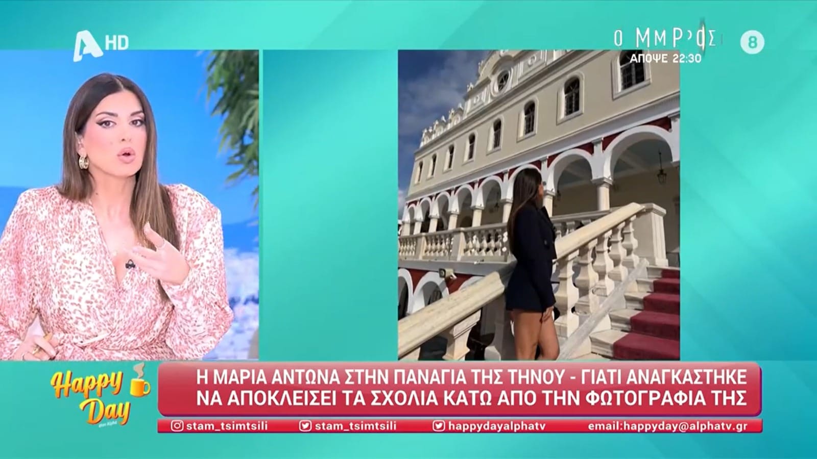 Η δημοσιογράφος Σταματίνα Τσιμτσιλή στην εκπομπή «Happy Day» του Alpha, σχολίασε τη φωτογραφία που ανέβασε η Μαρία Αντωνά από την Παναγία της Τήνου. Η φωτογραφία αυτή προκάλεσε έντονες αντιδράσεις, αναγκάζοντας την Αντωνά να απενεργοποιήσει τα σχόλια στην ανάρτησή της. Η Τσιμτσιλή ανέφερε ότι η intention of Αντωνά δεν ήταν να προκαλέσει, αλλά ότι είναι σημαντικό να υπάρχει μέτρο σε τέτοιες περιπτώσεις.