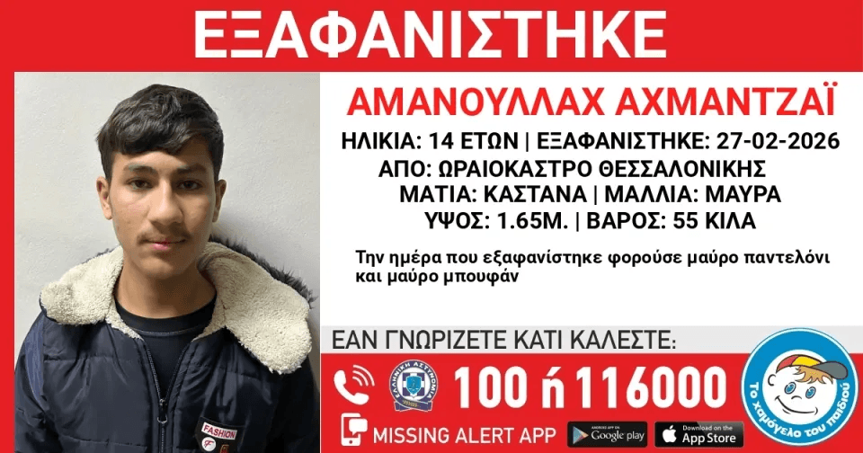 Συναγερμός έχει σημάνει στις Αρχές για τον εντοπισμό του 14χρονου Αμανουλλάχ Αχμαντζάι, ο οποίος εξαφανίστηκε την Πέμπτη 27 Φεβρουαρίου από χώρο φιλοξενίας ασυνόδευτων ανηλίκων στην περιοχή του Ωραιόκαστρο, στη Θεσσαλονίκη.
