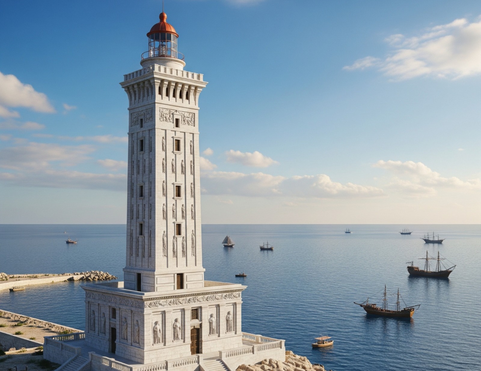 Κατασκευασμένος τον 3ο αιώνα π.Χ. υπό την αιγίδα του Πτολεμαίου Α’ Σωτήρος και ολοκληρωμένος από τον Πτολεμαίο Β΄ Φιλάδελφο, ο Φάρος της Αλεξάνδρειας έφτανε τα 100 μέτρα ύψος, καθιστώντας τον το δεύτερο ψηλότερο ανθρωπογενές οικοδόμημα της εποχής μετά τις Πυραμίδες της Γκίζας. Σχεδιασμένος από τον Έλληνα αρχιτέκτονα Σώστρατο τον Κνίδιο, ο Φάρος λειτουργούσε ως φάρος για τα πλοία στο πολυσύχναστο λιμάνι της Αλεξάνδρειας, ενώ συμβόλιζε την πολιτιστική και εμπορική ακμή της πόλης. Το φως του, παράγόμενο από φωτιά και αντανακλώμενο μέσω χάλκινου καθρέφτη, ήταν ορατό από απόσταση έως και 56 χιλιομέτρων.