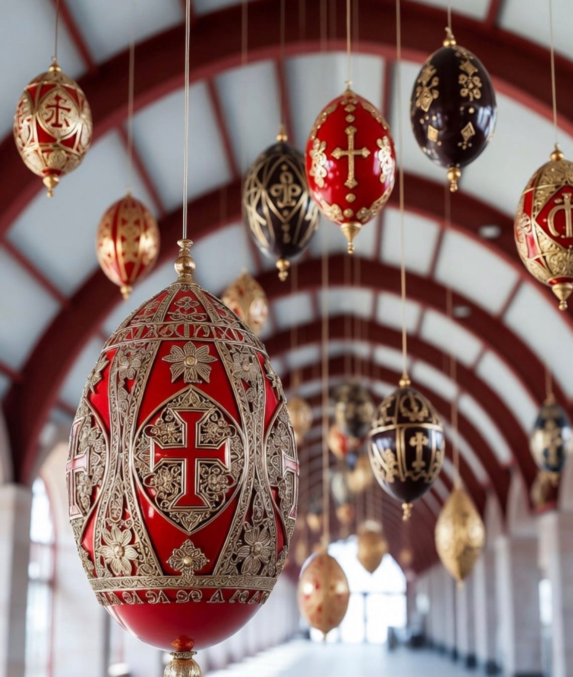 Στις εικόνες φαίνονται δεκάδες μεγάλα, χειροποίητα διακοσμημένα πασχαλινά αυγά – κόκκινα, σκούρα καφέ και με χρυσές λεπτομέρειες – που κρέμονται από την οροφή των σταθμών, δημιουργώντας μια μοναδική πασχαλινή ατμόσφαιρα. Οι επιβάτες περπατούν από κάτω, ενώ η διακόσμηση με κόκκινα μεταλλικά στοιχεία ενισχύει ακόμα περισσότερο το εορταστικό κλίμα.